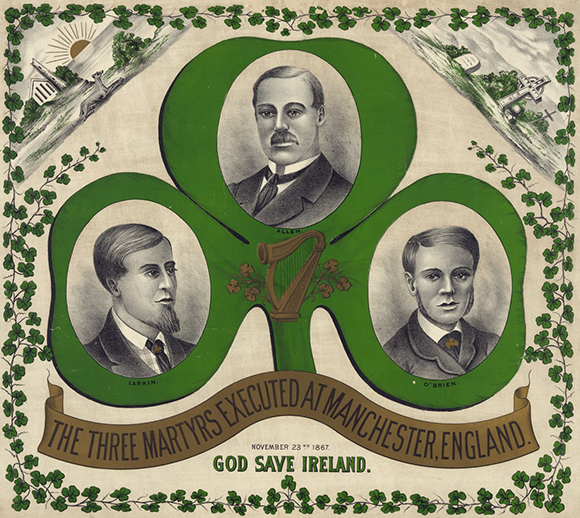 William Phillip Allen, Michael Larkin and Captain Michael O’Brien were three members of the Irish Republican Brotherhood (IRB) executed on 23 November 1867 for their alleged role on the attack of a police van carrying Fenian prisoners by the names of Kelly and Deasy, the attack resulting in the death of a police officer, Charles Brett. The prisoners escaped and were never recaptured, however Allen, Larkin and O’Brien were arrested, tried and executed. All three men gave their final speeches from the dock before their execution. They would become known in republican folklore as the Manchester Martyrs and their watchword “God Save Ireland!” would become iconic.